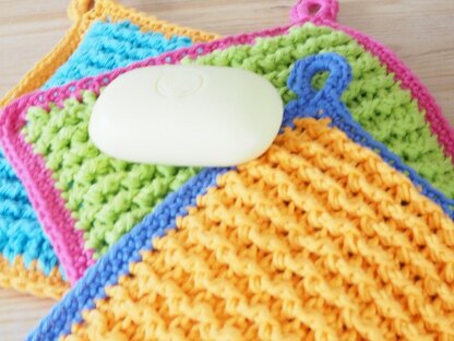 Use an aran weight cotton yarn to make your wash cloth. You will need 50g in the main colour and approx. 25g in the edging colour. The front post treble and the back post treble stitch pattern create a nice thick rib effect. Use a 5mm hook, or another size to obtain correct gauge, although the gauge isn’t totally critical on this project. The finished size is 18 cm square.