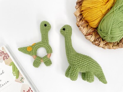 Crochet dinosaur Brontosaurus toy and baby teething rattle amigurumi pattern