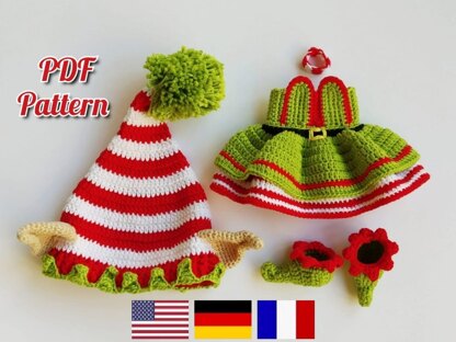 Crochet doll clothes pattern, crochet Elf outfit for Astrid, Christmas doll outfit pattern (English, Deutsch, Français)
