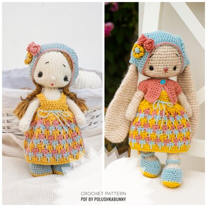 PDF Crochet Pattern Outfit “Baby Lea” for crocheted or knitted 10’’/25cm bunny and doll by Polushkabunny ABOUT THIS PATTERN Stitch-by-Stitch Crochet Pattern Process Images Suitable yarn brands All yarn parameters All tools recommendations