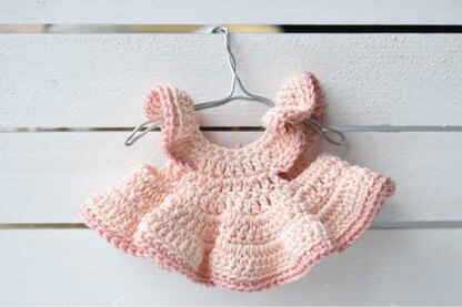 A beautiful ruffled crochet dress fits a doll with a chest circumference of 20 cm / 7.85 in. Fastened with a tie from the back. Length of the finished dress 8.5 cm / 3.35 in.