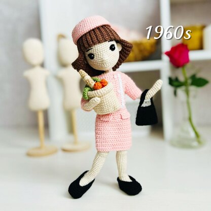 Crochet doll pattern, amigurumi doll, crochet doll clothes, Miss 1960s