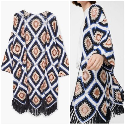 Enjoy turning heads this season in classically inspired long crochet cardigan with colorful floral granny square motifs!