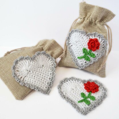 Crochet Heart Applique. Rose Embellishment. Floral Heart Topper