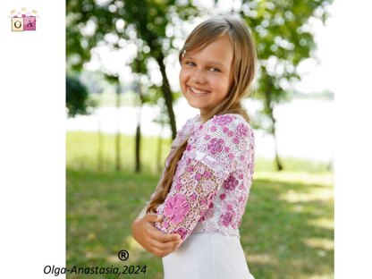 Crochet lace jacket for girls. Modern crochet Irish lace pattern . A detailed pattern for all crochet motifs - a graphic diagram, a photo and a verbal description of each crochet row. PDF file for 64 pages Design work by Starostina Olga.