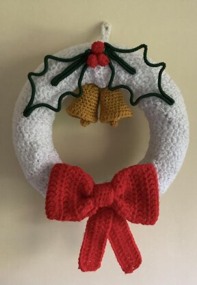 It is a 3 page pattern written in English using US terms with full instructions to create a 20cm wreath ring approx 40g White Dk for wreath Ring 20g Red for Bow 10g Gold for Bells 5g Green for Holly Leaves 2mm thick wire ( I used normal garden wire) Lights - optional 4mm Crochet Hook Yarn sewing needle Glue ( I used a Hot Glue Gun)