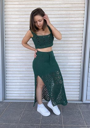 Crochet lovers, get ready to update your wardrobe with the latest addition to your collection! My new crochet pattern release features a stunning maxi skirt and matching crop top in a deep green color, designed with a boho twist that will make heads turn.