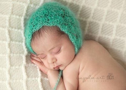This is a great beginner/intermediate pattern for a delicate newborn size bonnet. It would make a great photo prop.