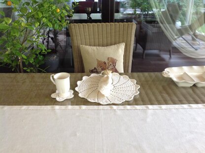 Measurement of the placemat will be around 13,5”/34 cm and the coaster will be around 4,5" /12 cm in diameter. Size 3/DK/Light worsted weight yarn is used on this design.