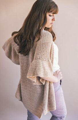 The Ruffle Sleeve Cardigan is equal parts feminine frill and loungewear, crocheted with soft and squishy Jeans Colors yarn. This pattern is really approachable as a first garment or a quick make for those more experienced – you’ll zoom along double crochetin’ and before you know it, you’ll be ready to layer this chic piece with every outfit from overalls to fancy dresses.