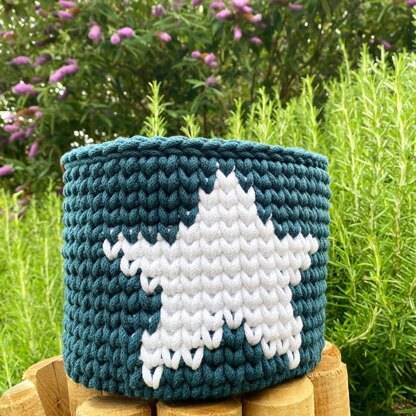 This lovely eye-catching basket with a contrasting star detail is a great way to add a touch of homemade to your home! The pattern uses UK terms and I use recycled cotton rope or t-shirt yarn, but any chunky yarn would work.