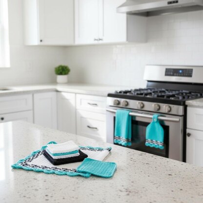 This tea towel set includes everything shown in the pictures. Tea towel, dish cloths and the stove towel. Super easy and quick to make. Makes a great gift for a new homeowner. So many colors to choose from to make it in.