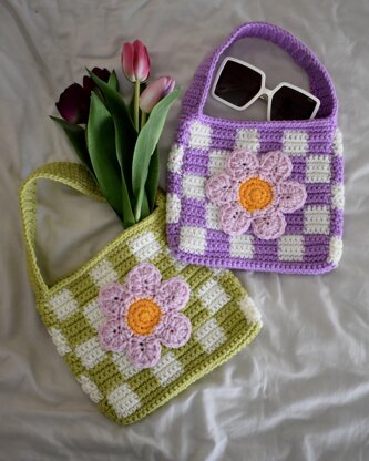 Checked bag with flower motif, the perfect bag for spring/summer! Made with chunky acrylic yarn to make a sturdy bag. This bag is great for confident beginners and above. I would say the most complicated skill you need to be able to do is changing yarn colours. This pattern is written in U.K terms with lots of pictures to help you understand each step. For personal use only.