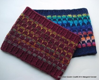 Worked in the round, the Crocheted Goodin Cowl features a shifting spike stitch pattern bordered with a textured rib. Stripes of solid or color-changing yarns add to the visual motion of the pattern.