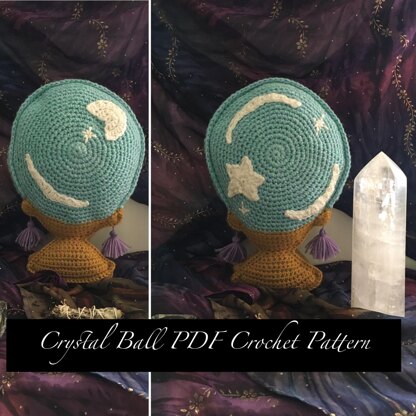 Seek comfort from beyond with this Crystal Ball pillow. Crystal Ball features a different motif on each side crescent moon with reflection marks and sparkles on one side and star and sparkles with reflection marks on the other. The crystal ball is made up using worsted weight and light worsted weight sparkle yarn together to give the pillow a magical feel!