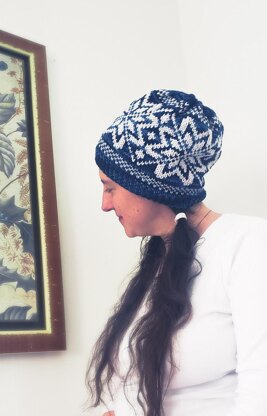 Crystal Echo is a warm and snuggly worsted weight, slouchy hat. It is knit in the round from the bottom up, with a twisted rib brim. Then the body of the hat features a bold snowflake graphic knit in stranded colorwork in two colors.