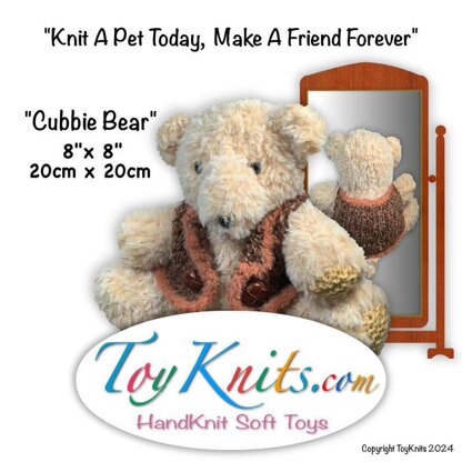 This baby bear cub is knit in faux fur yarn in pieces. All pieces are worked flat with the exception of the legs which are worked in the round. The pieces are then sewn together and stuffed. The face can be either sewn on or embroidered. The sweater-vest, knit in bulky yarn, keeps Cubby warm on winter nights !