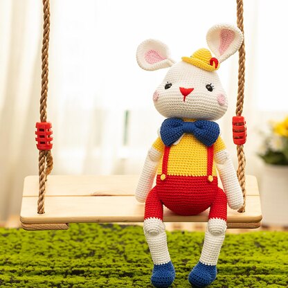 Size: The finished Pinocchio Puppet Bunny stands approx. 45 cm, 17.7 inches tall (sitting state about 30 cm). Certainly, the thinner yarn you use, the smaller the doll will be.
