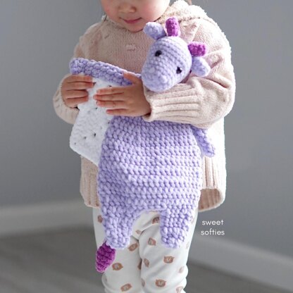 The Cuddle Dragon is a ragdoll lovey that has a flat body, mimicking a security blanket for babies, toddlers, and young children. This cute fantasy creature design is easy and works up quickly with super bulky yarn and a large, 5mm hook. It looks great with blanket yarn, polyester, chenille, or velvet yarn, though you can use other types of fibers too! The sample was created with Hobbii Baby Snuggle, perfect for a soft and cuddly toy. Customize this dragon blankie with different yarn colors, or turn it into a dinosaur by omitting the wings. The design is unisex and gender neutral, and can be for both boys and girls. Kids will adore snuggling up to this sweet doll! It makes a great craft fair product, as well as a birthday gift, holiday gift, baby shower gift for expecting moms, or for newborn and infant children.