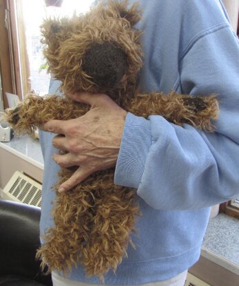 This fuzzy bear is very simple and cute. All of the pieces are worked separately and later seamed, and stuffed. Short rows are used to shape the head and feet, intarsia is used to create paws in a contrasting color.