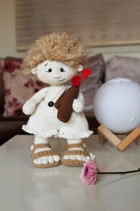Crochet Cupid is in PDF format in English and Dutch. The pattern consists of 17 pages accompanied by 40 photos. It includes US crochet terms. The finished product using the materials stated in this pattern is ~9 inches / 22-23 cm tall.