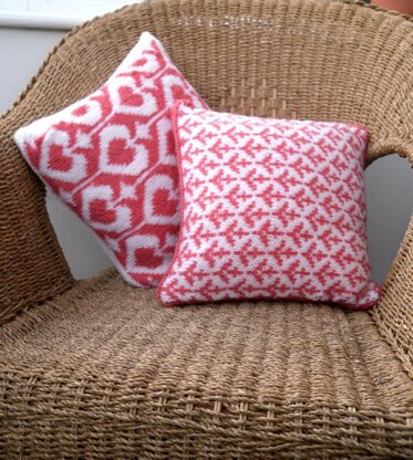 2 unique fair isle designs depicting cupid arrows and valentine hearts are featured on these simple knitted cushions. Each cushion is just 12” x 12”, ideal valentine decor for any room in the house or garden.
