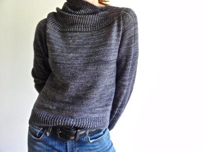 The body is cropped, boxy, comfortable and slouchy. The asymmetric collar, a panel down the left sleeve and the right side of the body, and the bands, are worked in twisted rib stitch.