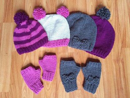 Stay extra cute and cozy this Winter with this adorable hat and glove set! This cuddly set will keep you so cozy, you may have a hard time taking it off! Knit with a super soft bulky yarn, this ensemble not only feels lovely on your head and hands, it knits up quickly too, woohoo! The hat features multiple fun and fashionable styling options, including stripes, bows, and the addition of pom-poms. The matching fingerless gloves can also be adorned in bows to make the perfect set. This pattern includes multiple sizes for both kids and adults, and makes an excellent gift.