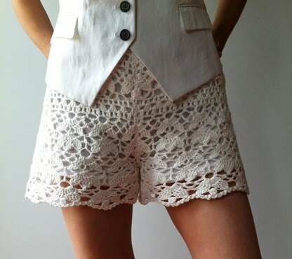 In a lovely floral stitch pattern, this adorable pair of drawstring shorts is a great summer wardrobe staple for around town or over swimsuit at the beach. The shorts are equally chic over tights, with boots for the winter. They are constructed from two symmetrical pieces, with crotch curves and higher back for comfortable fit. The pattern also includes instructions for longer pant legs (2" longer) and optional lining.