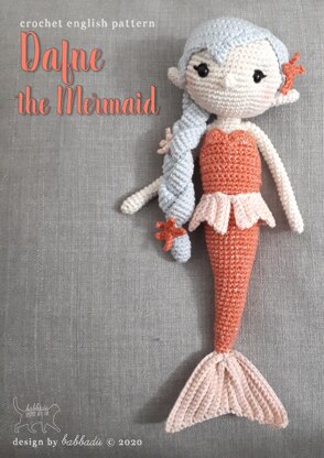 MATERIALS I used DROPS Muskat 50gr/100m DK yarn in cream for skin, coral, salmon pink and LA MIA COTTONY XL ice blue for hair, DROPS Glitter silver for fin, black thread to embroider eyes. hook 3 mm black safety eyes 9 mm fiberfill tapestry needle scissors pins stitch markers