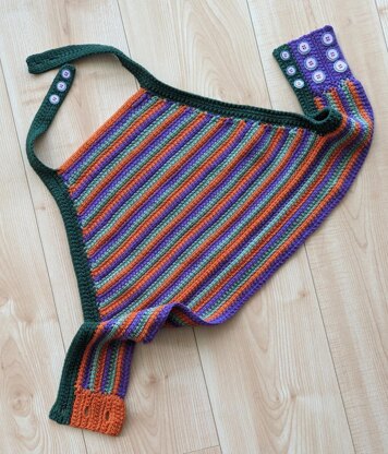 Construction consists of a chest piece, torso band, button and clasp squares that are sewn together while the straps are made directly onto the body.