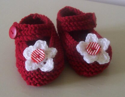 A simple knitting pattern for these sweet shoes with crocheted daisy and button trim. They can be made plain or have a button or other embellishment of your choice. Make them in colours to match your little one's wardrobe.