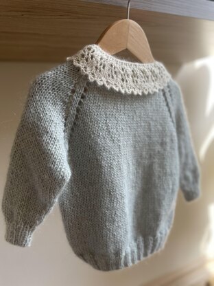 This cute, soft and fluffy baby round neck raglan cardigan is knit from the top down with two yarns held together, on US size 8 (5mm) needles. It features decorative yarnover increases, an i-cord edge without buttons and optional daisy lace collar attached at the end. The pattern for the lace collar is included, for more adventurous knitters.
