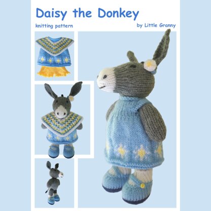 This pattern tells you how to knit Daisy the Donkey wearing a top down dress, frilly knickers, and poncho. Her shoes and socks are knitted as part of her body but the clothes are removable. She is knitted flat on two needles and the pieces are seamed up afterwards. This pattern comes as a PDF file and contains step by step instructions, colour photographs and handy tips.