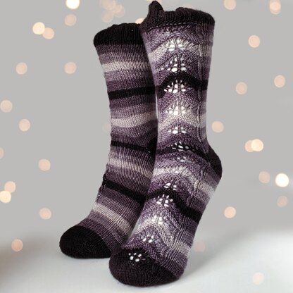 Worked in the round, Dale contains both cuff-down and toe-up written directions and a chart for the pattern stitch. The pattern has instructions for an afterthought heel, but you may substitute whatever heel you enjoy using.
