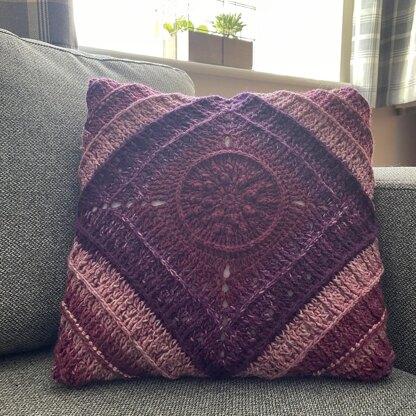 Worked from a single ball of colour changing yarn, the cushion construction transforms a simple pattern repeat into a stunning item. Stitch charts can be found beneath the written pattern.