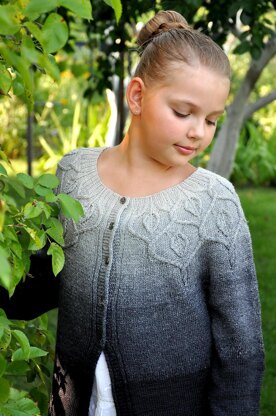 Stunning cables encircle the neckline of this light, delicate cardigan worked in stockinette. The Dancing Leaves girl’s cardigan is worked top down from the neck entirely seamless.