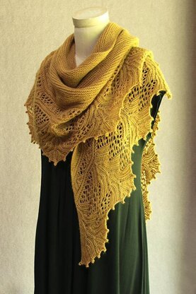 The lace pattern is a pleasure to knit, with lace stitches worked on right sides only. And the short-row shaped crescent is a cinch; no wraps or anything at all to fuss with.