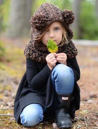 The sample was made with Lion Brand Hometown USA in Santa Fe Tweed and Lion Brand Heartland Thick & Quick in Black Canyon.