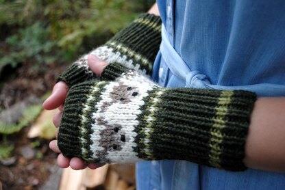 Another member of the Green Forest Gang is here to greet you! These Darling Deer are quiet and curious. They are perfect companions for pondering walks or soul-searching adventures. Be careful not to get lost in their big bashful eyes. Knitted in the round with 100% wool, these fingerless mitts are perfect for wearing during the spring and fall.
