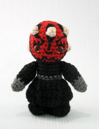 Darth Maul is a Sith apprentice, aligned to the dark side of the Force. He is an excellent fighter, using a double-ended lightsaber to great advantage, and his species has red skin with black tattoos, along with horns around his head. With this pattern you can make Maul, as well as a removable robe and his lightsaber.