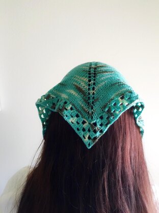 Datil is a little boho kerchief that starts as a knitted triangle shawl and ends with a crochet border and ties. The green colorway of this handpainted yarn inspired the name, which is the name of a yucca plant that grows here in the desert, and is also called the banana yucca. It combines both knit and crochet and requires intermediate skills.