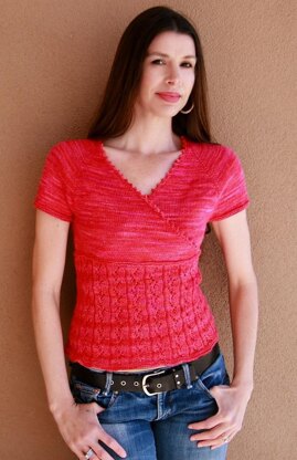 Inspired by the brightly colored trumpet vine flowers (commonly known at Angel’s Trumpet), this lightweight top is knit from the top (neck) down to the bottom hem. It features raglan shaping and short sleeves, with a faux wrap top, and a pretty delicate lace pattern for the body. The neckline is trimmed with an easy knit-on picot edging.
