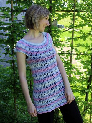 Allover lace and cool bamboo yarn: the perfect combination for the summer. Dawn is a seamless lace tunic worked from the bottom up. No need to know how to increase or decrease in a lace pattern, everything is *charted and written out for you.