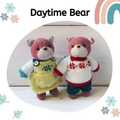 The pattern includes a basic bear body along with two sets of outfits: one for a boy and the other for a girl. The bear body design matches that of the sister pattern, 'Nighttime Bear.'