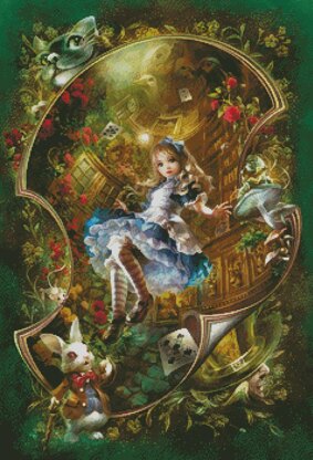 This counted cross stitch pattern of Alice was designed from beautiful artwork by SHU. Original image licensed through Meiklejohn Graphics Licensing Only full cross stitches are used in this pattern. It is a black and white symbol pattern. 99 DMC Colours are used.