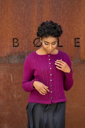 Named Dearaim, Irish for emblazon, is this seamless jacket adorned with small Celtic cables. The body is shaped for the bust and worked in one piece from the bottom to the armholes, while the sleeves are worked top down in stockinette stitch to make the cables stand out. The jacket ends in a crew neck that is crowned with an I-cord and a button band. Dearaim is knitted in the airy Norwegian combed wool yarn Ask from Hillesvåg Ullvarefabrikk.