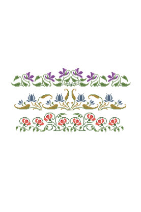 Dream of a regal romance with this decadent country garden free cross stitch design. Take your pick from three elegant floral motifs in rich purple, blue and pink, a great intermediate level project for adding a decorative border to a plain cushion or tea towel.