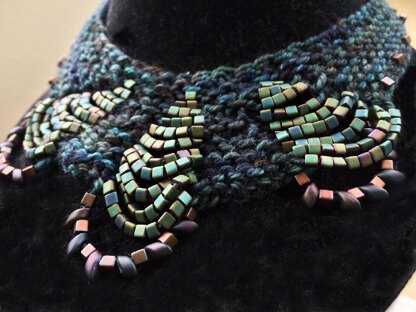 Beads are strung onto the yarn before casting on, and short rows are used for shaping. Most of the piece is constructed in garter stitch, which removes the need for concealing any wraps in the short rows.