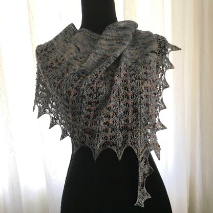 This is a lovely, feminine, lacework and beads shawl. It's a long assymetrical triangle shape - so easy to wear! It's fairly quick to work, even with the beads. The bottom edge is sexily scalloped with sharp points which occur naturally with the pattern and get more emphasized with blocking.